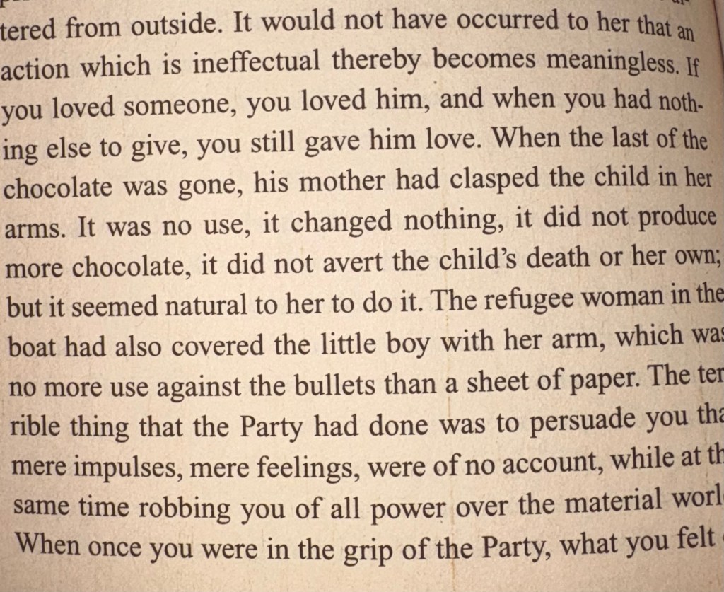 I don’t think that there is one perfect solution to solving the societal, systematic problems that have been built and enforced since before your existence, the main characters are constantly faced with the recognition and demoralization that the system is bigger than themselves as individuals. But, even so, I believe that sometimes all you have is yourself and all you can do is be there for yourself. Winston starts off the novel by buying a secret diary, his first lone act of stealthy rebellion. Just by taking that first step outside of his conditioning, the set of motions in the book are activated. The same can be said for your life. By putting forth the smallest intentional effort towards change, consciously deciding things can be different and you want them to be, the timeline can shift.